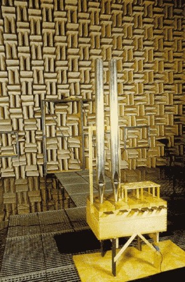 reflexionsarmer Raum: Im reflexionsarmen Raum des Fraunhofer-Instituts für Bauphysik (IBP) in Stuttgart wird untersucht, wie sich zwei Orgelpfeifen gegenseitig akustisch beeinflussen können. Die Orgelforschung ist ein wichtiges Fachgebiet innerhalb der musikalischen Akustik. Auf europäischer Ebene werden dort in enger Zusammenarbeit mit Orgelbaufirmen verschiedenste akustische Probleme im Orgelbau untersucht und Neuentwicklungen durchgeführt (Photo mit freundlicher Genehmigung von Dr. J. Angster, IBP).