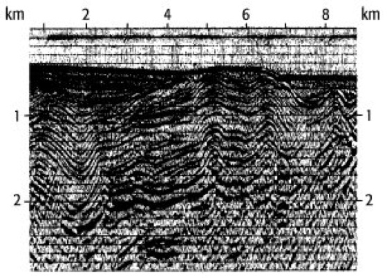 Reflexionsseismik: Bearbeitete Seismogrammsektion vom kalifornischen Kontinentrand.