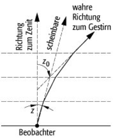 Refraktion in der Erdatmosphäre: Der Lichtstrahl eines Gestirns mit Zenitabstand z0 wird gebrochen, so daß der Stern vom Erdboden aus gesehen den Zenitabstand z zu haben scheint.