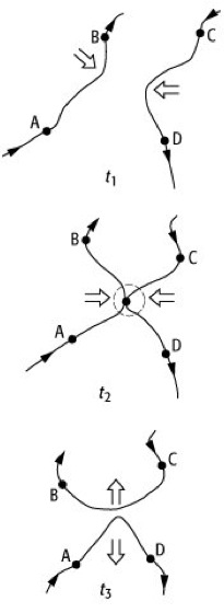 Rekonnexion: Schematische Darstellung der Rekonnexion zu den Zeitpunkten t1, t2, t3.