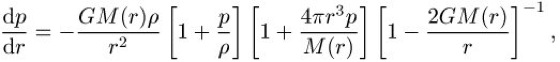 gilt). Die Oppenheimer-Volkoff-Gleichung ist die relativistische Verallgemeinerung der Gleichgewichtsbedingung zwischen Gravitationskraft und Druckkraft. Zur Lösung benötigt man noch die Zustandsgleichung