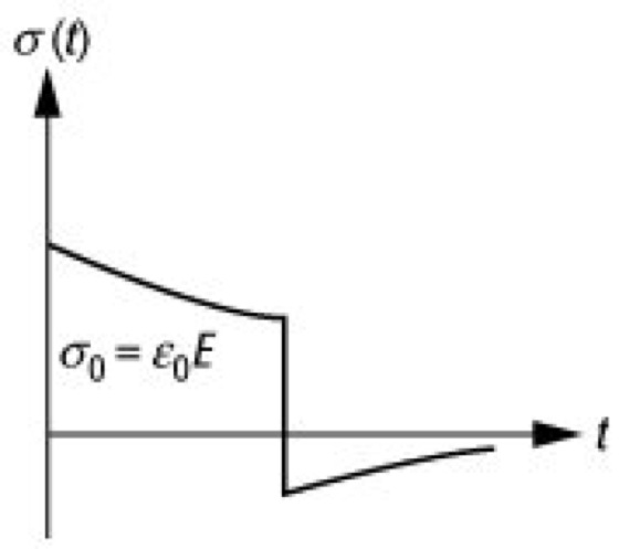 Relaxationsprozesse: Relaxationskurve eines viskoelastischen Stoffes; Bereich I: Dehnung = const., Bereich II: Dehnung geht sprunghaft auf Null.