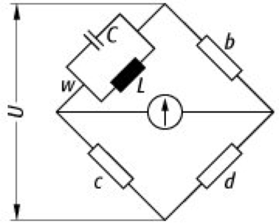 Resonanzbrücke: Schaltbild (C: Kondensator, L: Spule, w: Wirkwiderstand des Schwingkreises, b, c, d: Widerstände der drei restlichen Brückenzweige).