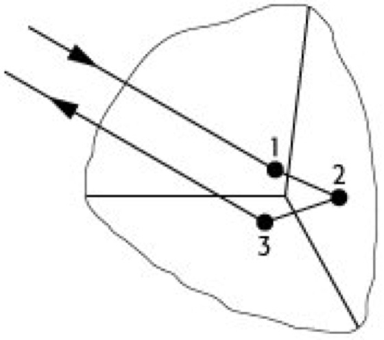 Retroreflektor, Tripelspiegel, Spiegelanordnung, die aus drei zueinander senkrecht stehenden Planspiegeln besteht und es ermöglicht, einen Lichtstrahl unabhängig von der Lage des Retroreflektors durch Reflexion um 180 ° abzulenken, wobei die Richtungsänderung invariant gegenüber einer Drehung des Systemes um beliebige Achsen ist (siehe Abb.). Die Richtungsänderung ist dabei von einer Parallelversetzung begleitet.
