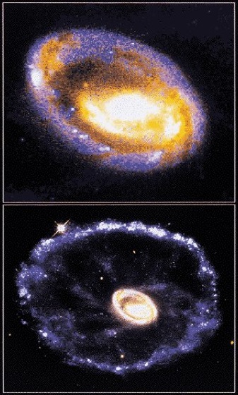 Ringgalaxien, Galaxien, in denen ein Ring aus Gas und Sternen den Zentralbereich umgibt. Man vermutet, daß diese Struktur entsteht, wenn eine kleine Galaxie senkrecht durch die Scheibe einer großen Spiralgalaxie hindurchfliegt.
