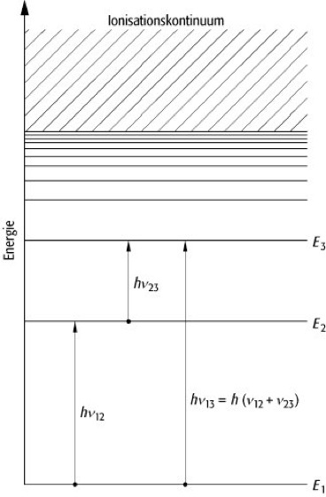 Ritzsches Kombinationsprinzip: Schema eines beispielhaften Übergangs: Sei ν12 die Frequenz des Übergangs von E1 nach E2 und ν23 die Frequenz des Übergangs von E2 nach E3, so ergibt sich die Frequenz ν13 des Übergangs von E1 nach E3 als Summe der Frequenzen der einzelnen Übergänge: ν13 = ν12 + ν23.