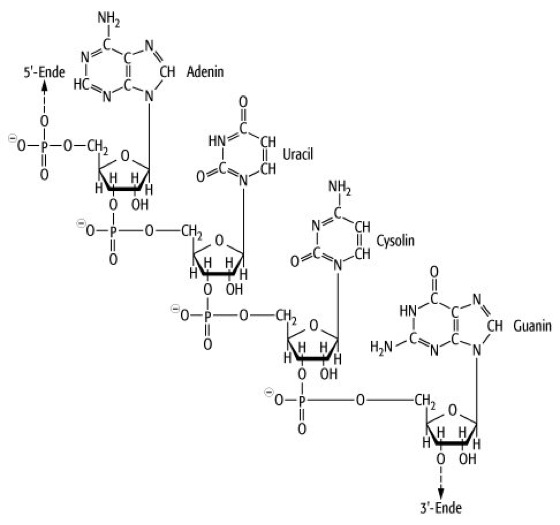RNS, RNA, Ribonucleinsäure, hochpolymere lineare Kettenmoleküle (Biomakromoleküle), die als monomere Bausteine neben einigen seltenen Nucleotiden hauptsächlich vier Standard-Nucleotide besitzen: Adenosin-5'-Monophosphorsäure (Abk. A), Cytidin-5'-Monophosphorsäure (C), Guanosin-5'-Monophosphorsäure (G) und Uracil-5'-Monophosphorsäure (U) (siehe Abb.).