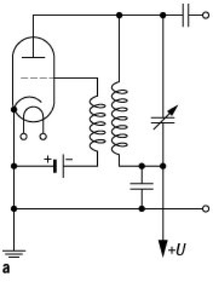 Röhrengenerator: Beispiel für eine Schaltung mit induktiver Rückkopplung (›Colpitts-Schaltung‹).