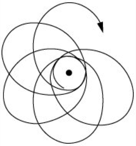 Rosettenbahnen, Bahnen, die die Außenelektronen der Alkaliatome (bei Berücksichtigung relativisischer Korrekturen auch die des Wasserstoffatoms) durchlaufen. Man kann sich diese Bahnen durch Ellipsen entstanden denken, deren große Achse sich während des Durchlaufens langsam dreht (siehe Abb.). Solche Bahnen kommen zustande, wenn ein Massenpunkt sich in einem Zentralfeld bewegt, dessen Kraftgesetz nicht genau mit 1 / r2 geht.