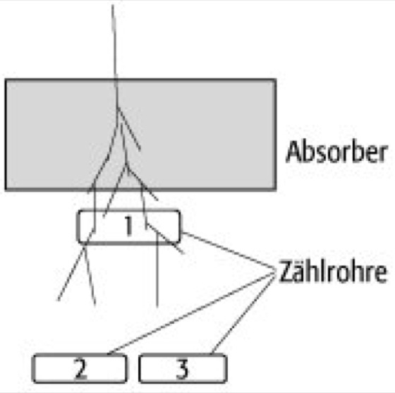 Rossi-Kurve: Meßanordnung aus drei Zählrohren zur Bestimmung der lateralen Ausdehnung eines Schauers.