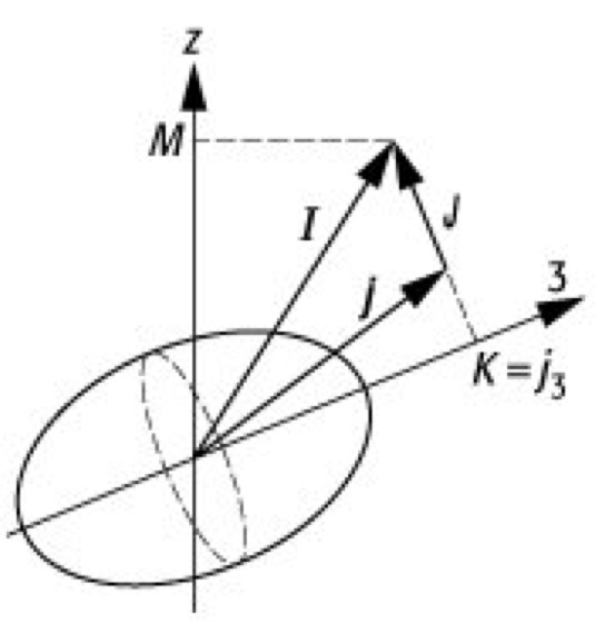 Bei axialsymmetrischer Kerndeformation, bei der die 3-Achse gleich der Symmetrieachse ist, existieren quantenmechanische Rotationseigenzustände nur um die 1-und 2-Achsen des körpereigenen Koordinatensystems, wobei die Drehimpulse J immer senkrecht zur 3-Achse sind. Die klassisch erlaubte Rotation um die Symmetrieachse führt zu ununterscheidbaren Zuständen und ist quantenmechanisch nicht existent. Die Projektion K = j3 des körpereigenen Drehimpulses j auf die 3-Achse verbleibt bei der kollektiven Rotation als ›gute‹ Quantenzahl.
