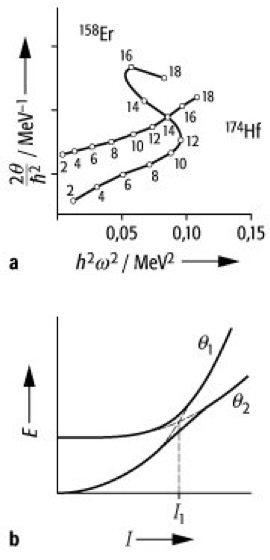 deformierter Kerne innerhalb einer Rotationsbande. Die Anomalie wird deutlich in der Auftragung des Trägheitsmomentes über dem Quadrat der Rotationsfrequenz ω (siehe Abb. a). Für Kerne der Lanthaniden wurde abweichend zum normalerweise linearen Anstieg bei durch Zentrifugalkraft zunehmender Deformation ein S-förmiger Verlauf (backbending) des Trägheitsmomentes für Hochspin-Zustände der Grundzustandsbanden beobachtet. Er entspricht einem sprunghaften Anstieg des Trägheitsmomentes. Das Phänomen wird als Kreuzung der Grundzustandsbanden mit einer Rotationsbande größeren Trägheitsmomentes verstanden (siehe Abb. b). Mikroskopisch zeigt es den Aufbruch gepaarter Nukleonen bevorzugt mit großem Einteilchendrehimpuls und dessen Projektion auf die Körpersymmetrieachse durch die Coriolis- Kraft an. Der vollständige Aufbruch der Paare ist in der prolat superdeformierten Rotationsbande erreicht, die im Rahmen hochauflösender Vielfach-Koinzidenz-γ-Spektroskopie nach Fusionsreaktionen beispielsweise für 152Dy entdeckt wurde.