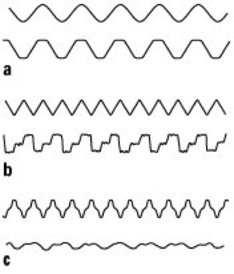 Saitenschwingungen 1: Beispiele für die Schwingungsformen a) gezupfter (Laute), b) gestrichener (Geige), c) geschlagener (Klavier) Saiten. Es wurde jeweils der Ausschlag eines bestimmten Saitenpunktes als Funktion der Zeit dargestellt.