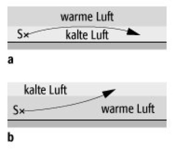 Schallbrechung: a) Brechung zum Erdboden hin, b) Ablenkung nach oben in kalte Luftschichten (S: Schallquelle).