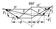 Scheimpflug-Bedingung: Abbildung bei erfüllter Scheimpflug-Bedingung (F, F': Brennpunkte, H, H': Hauptebenen und y, y': Größe von Objekt und konjugiertem Bild, a, a': Objekt- bzw. Bildweite des Achsenpunktes, σ, σ': Neigungswinkel von Objekt- bzw. Bildebene.