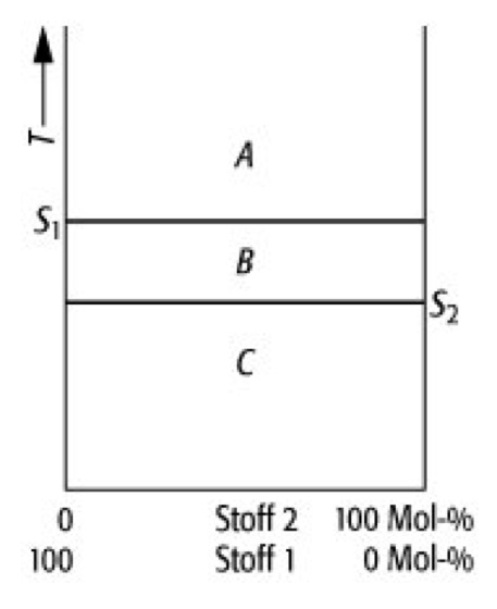 Schmelzdiagramm 1: System mit völliger Unmischbarkeit im flüssigen und festen Zustand unter Normalbedingungen (A, B, C: verschiedene Phasenräume, S1, S2: Schmelzpunkte der beiden Komponenten 1 und 2).