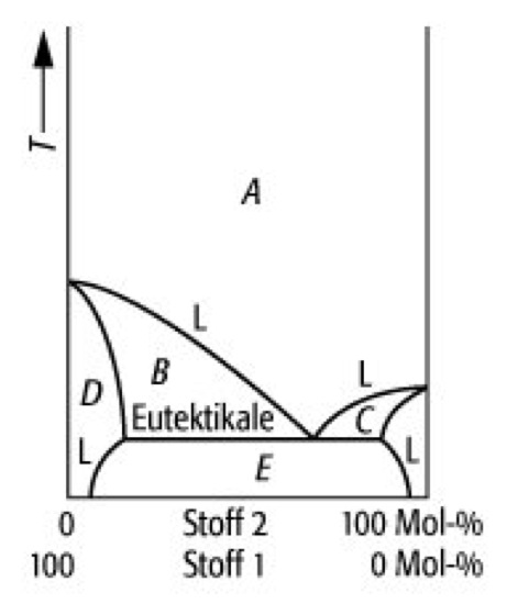Schmelzdiagramm 3: System mit völliger Unmischbarkeit im festen Zustand und Bildung eines Eutektikums, der Mischung am eutektischen Punkt, wo das Eutektikum wie ein reiner Stoff an dieser einen, festen Temperatur erstarrt. Dort liegen 4 Phasen vor: die beiden reinen Komponenten, die Schmelze und die gasförmige Phase der Komponenten.
