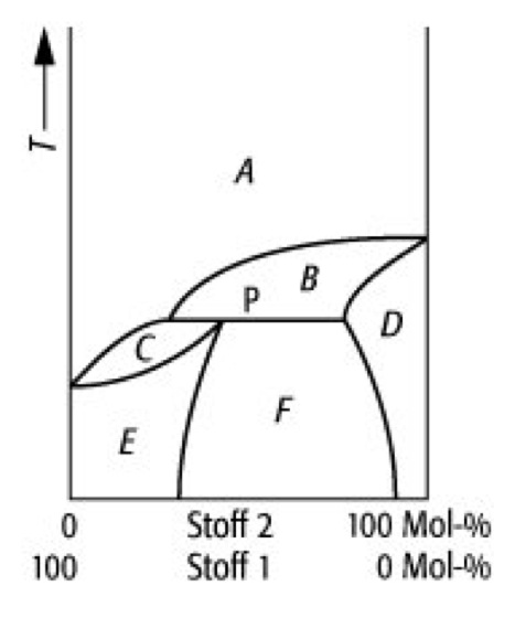 Schmelzdiagramm 6: System, bei dem die Mischungslücke bis in das Temperaturgebiet reicht, in dem die Mischkristalle aus der Schmelze gebildet werden. Es entsteht dann ein Peritektikum P, bei dem die Mischkristallart E bei Erhöhung der Temperatur in Schmelze und die Mischkristallart D zerfällt.