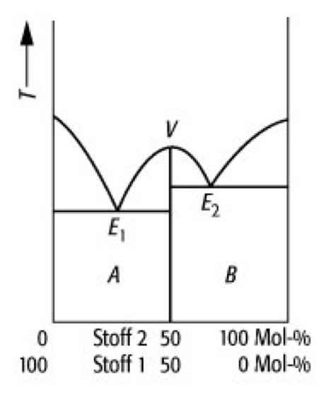 Schmelzdiagramm 7: System mit kongruent schmelzender Verbindung, die unzersetzt direkt in die Schmelze oder Lösung übergeht. Es treten stets ein Maximum (V) und zwei eutektische Punkte E1 und Ε2 auf.