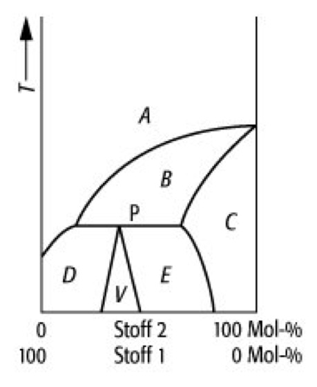 Schmelzdiagramm 8: System mit inkongruent schmelzender Verbindung V, die vor dem Schmelzvorgang in ihre Bestandteile Schmelze A und Mischkristalle C zerfällt. Die Verbindungen bilden ein Peritektikum (P).
