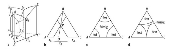Schmelzdiagramm 9: Räumliches Modell für ein Dreistoffsystem (a) und drei Projektionen; b) Ermittlung der Konzentration eines beliebigen Punktes P durch Projektion auf die Grundfläche; parallel zur Grundfläche ausgeschnittene Isothermen c) Temperatur T1, d) bei Temperatur T2, T2< T1.