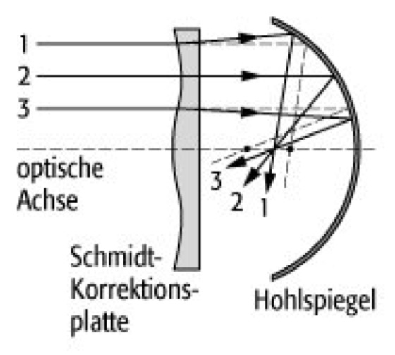 Schmidt-Spiegel: bestehend aus Hohlspiegel und Schmidt-Platte zur Korrektur des Öffnungsfehlers.