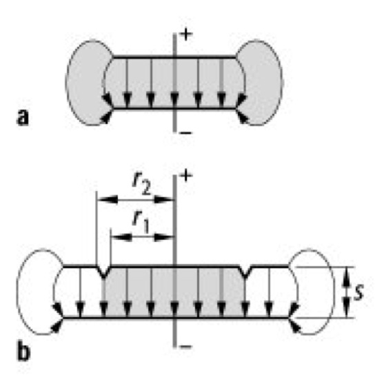 Schutzringkondensator: a) Kondensator ohne Schutzring; b) Kondensator mit Schutzring, die markierte Fläche ist der effektive Feldraum.