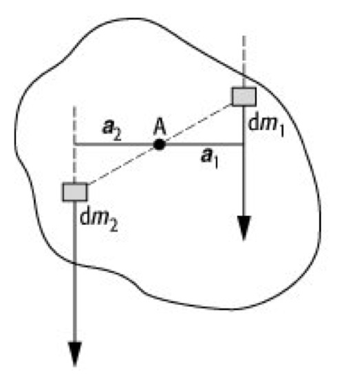 gegeben ist. Der Integralausdruck ist für kontinuierliche Systeme notwendig. Nach der Form der Massenverteilung spricht man von Linien-, Flächen- oder Körperschwerpunkt. Unterstützt man einen starren Körper im Schwerpunkt, so wird die Schwerkraft kompenisert und er bleibt im Gleichgewicht. Jedes Massenelement dm übt nämlich ein Drehmoment bezüglich einer durch den Schwerpunkt gehenden Achse A aus, das durch ein auf der entgegengesetzten Seite des Schwerpunktes liegendes Element dm' kompensiert wird (siehe Abb.). Das Integral