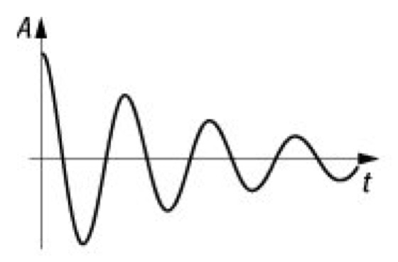 Schwingfall: Schwingfall bei einer gedämpften harmonischen Schwingung. Das System führt Oszillationen aus, während die Amplitude A mit der Zeit t immer weiter abnimmt.