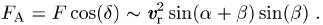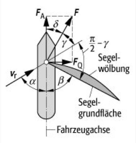 senkrecht zur Segelfläche hat (α, β, γ: Winkel zwischen vr und Bootsachse, Segelfläche, Antriebskraft). Längs und quer zur Fahrzeugachse ergeben sich die Komponenten FA und FQ (Antriebs- und Quertriebskraft). FQ wird im wesentlichen vom Schwert aufgefangen und kann in erster Näherung vernachlässigt werden, für FA gilt: