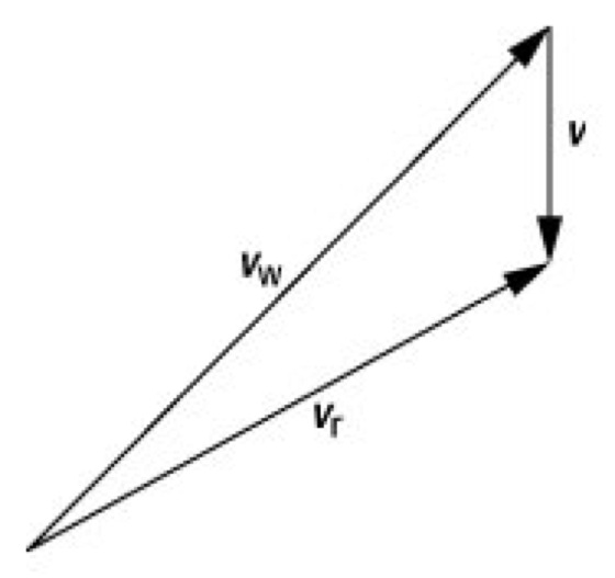 Segeln 1: Kräftediagramm: vw: Windgeschwindigkeit relativ zum Wasser (›wahrer Wind‹), vr: Windgeschwindigkeit relativ zum Fahrzeug (›scheinbarer Wind‹), v: Fahrzeuggeschwindigkeit relativ zum Wasser.