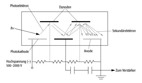 Sekundärelektronenvervielfacher, SEV, Photomultiplier (PM), Photoelektronenvervielfacher, Gerät zum Nachweis von Strahlung mittels äußerem Photoeffekt. Strahlung löst an einer Photokathode Elektronen aus, die über eine Verstärkungskette von Dynoden bis zur Anode in ihrer Zahl vervielfältigt werden. Der resultierende Stromimpuls wird umgewandelt, verstärkt und gemessen. Charakteristisch ist die mittlere Verstärkung als Antwort auf ein Photoelektron (single photoelectron response), die im Bereich von einigen 107 liegt.