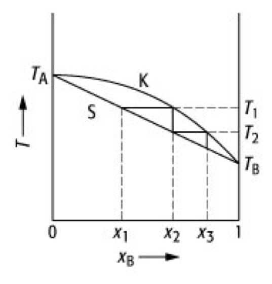 Siedediagramm, Phasendiagramm, das den Siedepunkt einer Mischung bei einem bestimmten Druck (z.B. Atmosphärendruck) in Abhängigkeit von der Zusammensetzung der flüssigen Phase wiedergibt. Die Zusammensetzung wird als Molenbruchx angegeben. Die Siedediagramme unbegrenzt mischbarer Komponenten sind Dampfdruckdiagramme, die aus zwei Kurven bestehen, einer SiedekurveS und einer KondensationskurveK (siehe Abb. 1). Eine flüssige Mischung der Zusammensetzung x1 siedet bei T1. Der gebildete Dampf (Kondensationskurve) hat die Zusammensetzung x2. Er ist reicher an Komponente B, da diese einen niedrigeren Siedepunkt hat. Wird dieser Dampf kondensiert (Siedekurve), so siedet die resultierende Flüssigkeit bei T2 und bildet den Dampf mit x3. Durch mehrfaches Wiederholen dieses Vorgangs, z. B. bei der Rektifikation auf den einzelnen Böden einer Destillierkolonne, wird die reine Komponente B erhalten.