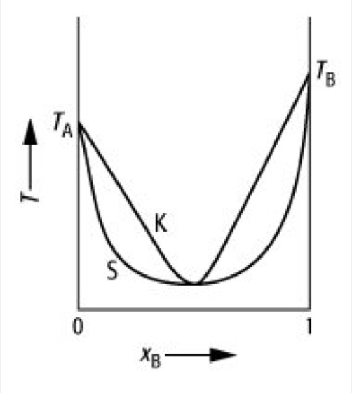 Siedediagramm 1: Siedediagramm der Komponenten A und B mit Siedetemperaturen TA und TB (K: Kondensationskurve, S: Siedekurve, xB: Molenbruch der Komponente B).