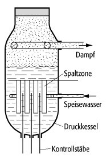Siedewasserreaktor, Variante eines Leicht-wasserreaktors, bei der das Wärmeaustauschmedium Wasser direkt zur Dampferzeugung ohne die Zwischenschaltung eines Wärmetauschers (wie beim Druckwasserreaktor) verwendet wird. Das Kühlmittel strömt von unten nach oben zwischen den Brennstäben hindurch, wobei es sich bis zum Sieden erhitzt. Aus dem Reaktorkern tritt somit so ein Wasser-Dampf-Gemisch aus. Oberhalb des Reaktorkerns wird das Wasser abgeschieden und der Sattdampf wird direkt der Turbine zugeführt, wo er entspannt wird und hierbei Arbeit verrichtet. Der aus der Turbine austretende Dampf kondensiert im Kondensator; das Kondensat wird vorgewärmt und mittels einer Speisewasserpumpe dem Reaktor wieder zugeführt (siehe Abb.). Wegen des Fehlens des Wärmetauschers wird die Dampfturbine kontaminiert und befindet sich daher in einer kontrollierten Zone. (Kernreaktor)