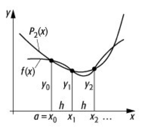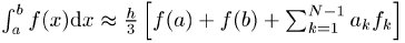 Simpson-Regel: Die Interpolation der Funktion f durch das Polynom P2 mit äquidistanten Stützstellen xi = a + hi ermöglicht eine numerische Integration im Intervall [a, b], welches in N Teilintervalle unterteilt ist: