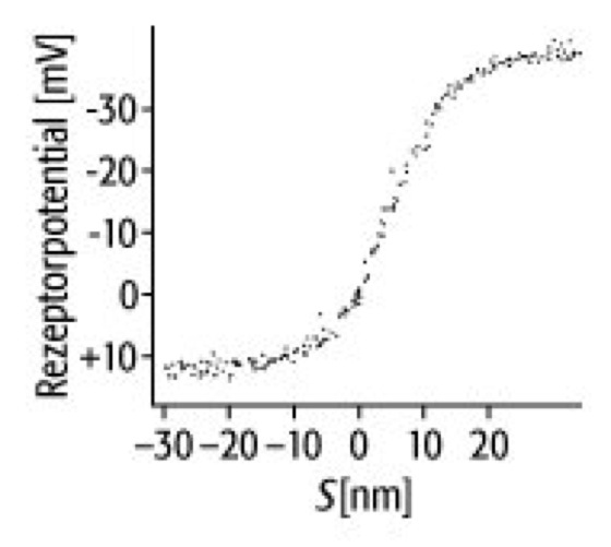 Sinnesleistungen von Lebewesen 2: Mechanorezeption bei einer Haarsensille (Heimchen); am zellseitigen Ende genügen Auslenkungen S von wenigen Nanometern für eine nachweisbare Reaktion.