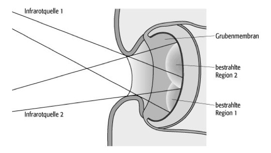 Sinnesleistungen von Lebewesen 3: Die Optik des Grubenorgans erlaubt nach dem Prinzip der Lochkamera eine Bestimmung der Position einer Strahlungsquelle: Die Öffnung der Grube beträgt ca. ein Drittel des Durchmessers der wärmeempfindlichen Membran. Es trifft daher nur ein kegelförmiger Ausschnitt einer Strahlungsquelle auf die Membran.