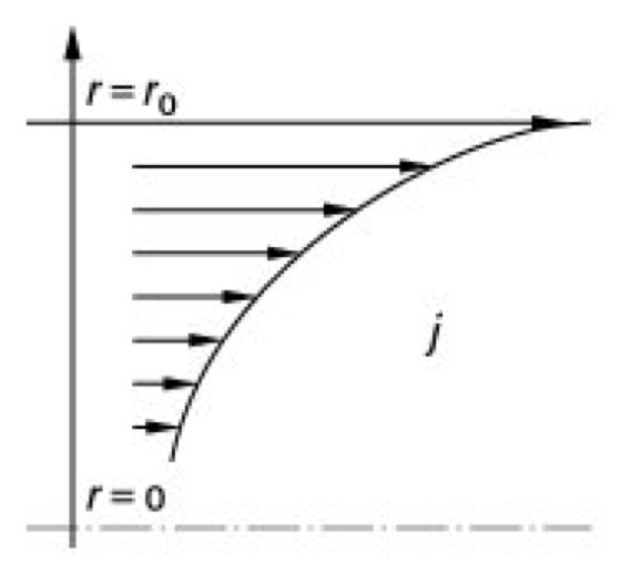 Skineffekt: Verteilung der Stromdichte j in einem zylindrischen Leiter mit Radius r0 bei hohen Frequenzen.