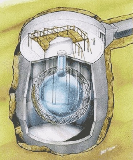 SNO, Sudbury Neutrino Observatory, Experiment zur Untersuchung von Neutrinos der Sonne (solare Neutrinos) und anderer astrophysikalischer Quellen. Das Observatorium befindet sich etwa 2 000 Fuß unter der Erde in der Creighton Mine bei Sudbury, Ontario, Kanada. Das Experiment besteht aus einem Wasser-Tscherenkow-Zähler mit etwa 1 000 t schwerem Wasser (D2O) in einer Kugel mit 12 m Durchmesser. Durch die Verwendung von schwerem Wasser können erstmals in einem Experiment sowohl die geladenen Ströme als auch die neutralen Ströme in der Neutrinowechselwirkung unabhängig vom zugrundeliegendenden solaren Modell untersucht werden. Die Tscherenkow-Strahlung wird von 9 600 Photomultipliern registriert. Umgeben wird diese Kugel von einer weiteren, 30 m durchmessenden Kavität mit 7 000 t normalem Wasser, um Untergrundeffekte zu unterdrücken. Die Beobachtung von Elektron-Neutrinos und weiterer Neutrino-Flavors erlaubt die detaillierte Untersuchung von Vakuum-Neutrinooszillationen und des MSW-Effekts. (Neutrinophysik)