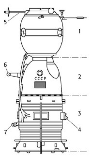Sojus-Raumkapsel: Schematische Skizze der Kapsel. 1 Orbit-Sektion, 2 Kommandomodul, 3 Versorgungs- und Antriebssektion, 4 Sonnensensoren, 5 Kopplungsstutzen, 6 optische Orientierungseinheit, 7 Infrarotsensor.