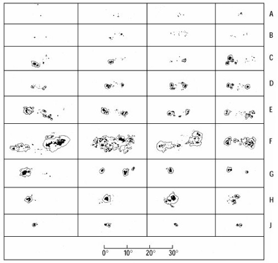 Sonnenflecken: Die Züricher Fleckenklassifikation (nach M. Waldmeier) von Sonnenflecken. Fleckengruppen beginnen in der Stufe A oder B und entwickeln sich nach 8-10 Tagen über die Stufen C, D, E bis zur Stufe F. Der nachfolgende Zerfall dauert meist länger (G-J). Nicht alle Fleckengruppen erreichen die Stufen E und F, manche Flecken kommen sogar über das Anfangsstadium nicht hinaus.
