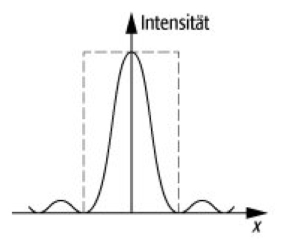 Spalt 2: Bild des Optimalspaltes (gestrichelte Linie) und Beugungsbild der Öffnungsblende (durchgezogene Linie) in der Auffangebene.