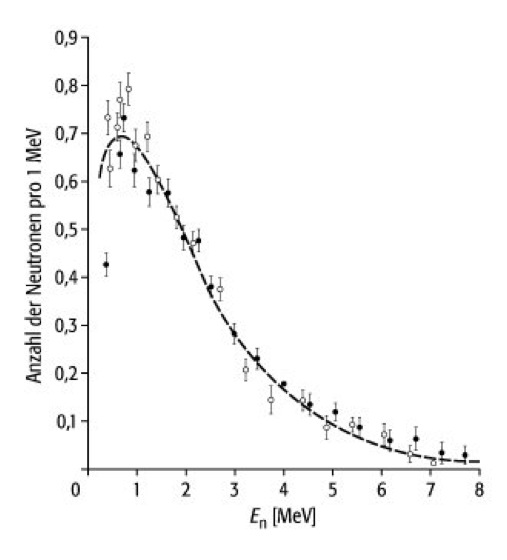 Spaltneutronen: Spektrum der Spaltneutronen als Funktion ihrer Energie En. Die leeren Kreise stellen das Spaltspektrum für die 235U-Spaltung, die gefüllten Kreise das für 239Pu-Spaltung mit thermischen Neutronen dar.