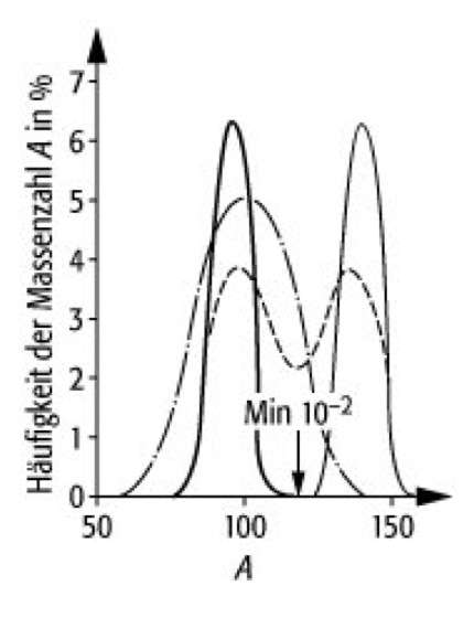 Spaltung von Atomkernen 1: Häufigkeitsverteilung der Spaltprodukte als Funktion ihrer Massenzahl A: Spaltung von 235U mit langsamen Neutronen (durchgezogen), Spaltung von 232Th mit 38-MeV-α-Strahlen (gestrichelt), Spaltung von 209Bi mit 200-MeV-Deuteronen (Strichpunkt).