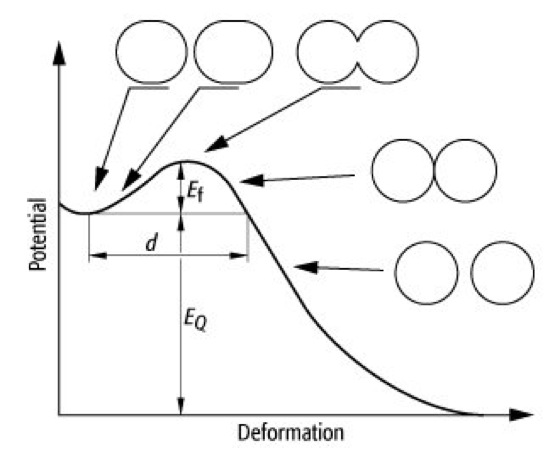 Der Spaltvorgang läßt sich im Tröpfchenmodell als eine dynamische axiale Kerndeformation beschreiben, wobei die Coulomb-Energie ab- und die Oberflächenenergie anfänglich zunimmt, so daß sich eine Potentialmulde ausbildet. Überschreitet die Kernanregungsenergie die Spaltbarriere