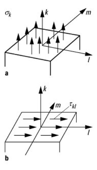 Spannung: a) Normalspannungen σk an der Fläche l, m; b) Schubspannungen τkl an der Fläche l, m.