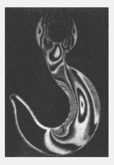 Spannungsoptik 1: Optische Darstellung von Linien gleicher Spannung an einem belasteten Haken.