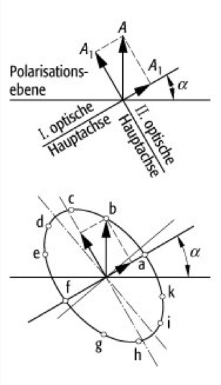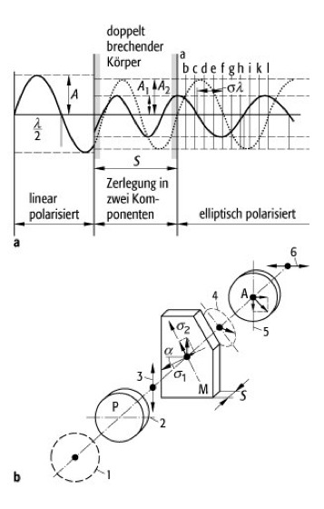 Spannungsoptik 2: a) Aufteilung der linear polarisierten Schwingung im doppelbrechenden Körper; b) spannungsoptische Modellmessung. 1 Lichtquelle, 2 Polarisationsebene (waagerecht), 3 Lichtschwingung (eben polarisiert), 4 Lichtschwingung (elliptische polarisiert), 5 Polarisationsebene (senkrecht), 6 Lichtschwingung, P: Polarisator, A: Analysator, σ1,2: Hauptspannungen.