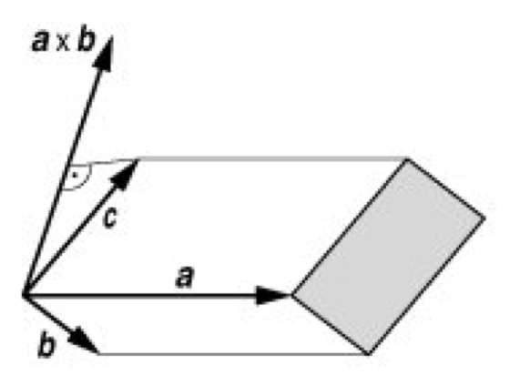 Spatprodukt: Der Betrag des Spatprodukts entspricht dem Volumen des von a, b und c aufgespannten Parallelepipeds.